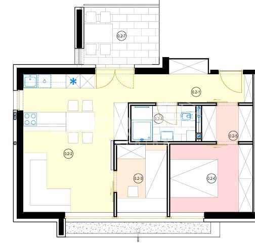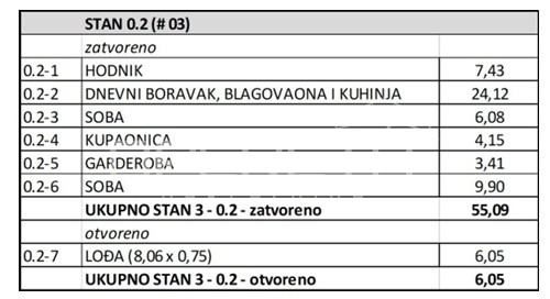 Stan oznake S3 nalazi se u visokom prizemlju stambene zgrade u izgradnji od ukupno 2 kata. Sastoji se od velikog "open space" dnevnog boravka s kuhinjom i blagovaonicom te izlazom na lođu, 2 sobe, kupaonice s wc-om, zasebne garderobe i hodnika.