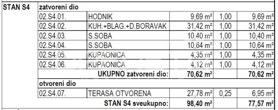 Neto korisna površina stana iznosi 81,40 m2 (77,57 m2 stan; 1,33 m2 spremište; 3,12 m2 vanjsko parkirno mjesto).