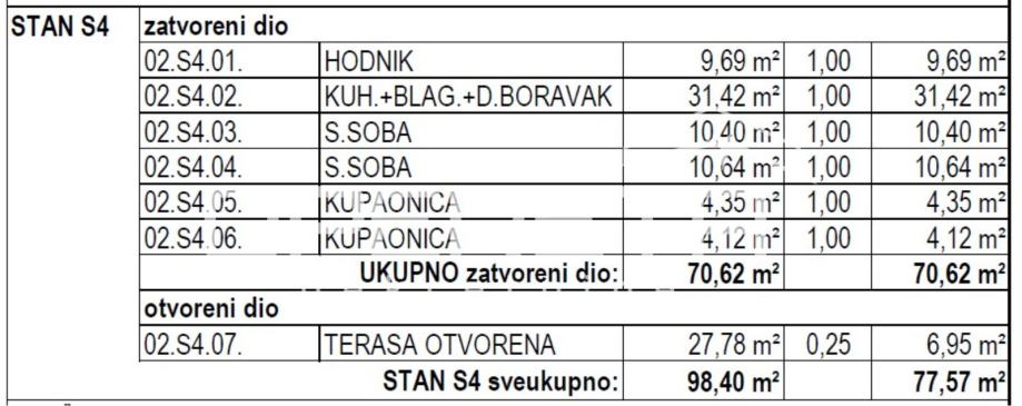 Neto korisna površina stana iznosi 81,40 m2 (77,57 m2 stan; 1,33 m2 spremište; 3,12 m2 vanjsko parkirno mjesto).