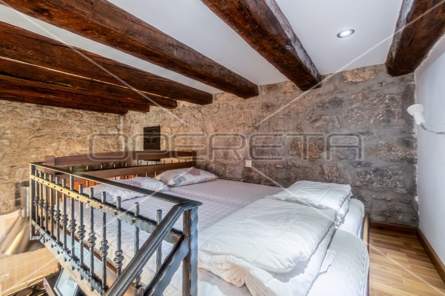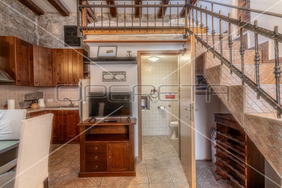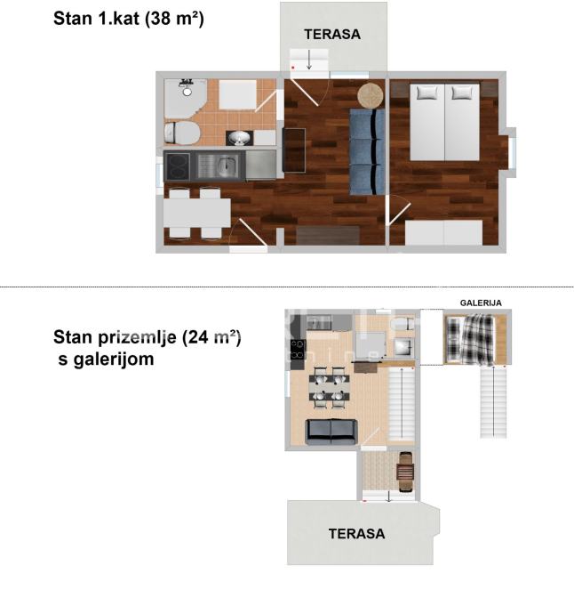 Prvi stan se nalazi u prizemlju zgrade sa ukupno četiri stana te njegova površina iznosi 24m2 te je koncipiran kao studio apartman s galerijom koji je namjenjen kao spavaonica. Stan u prizemlji ima na korištenje terasu površine 30m2.