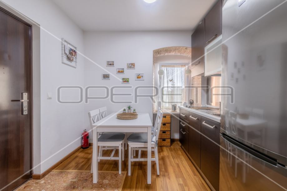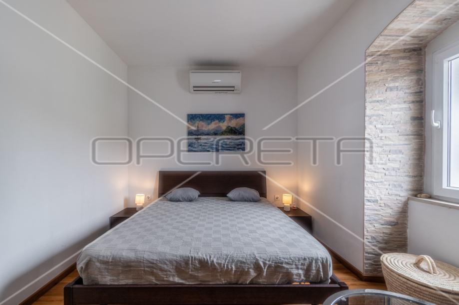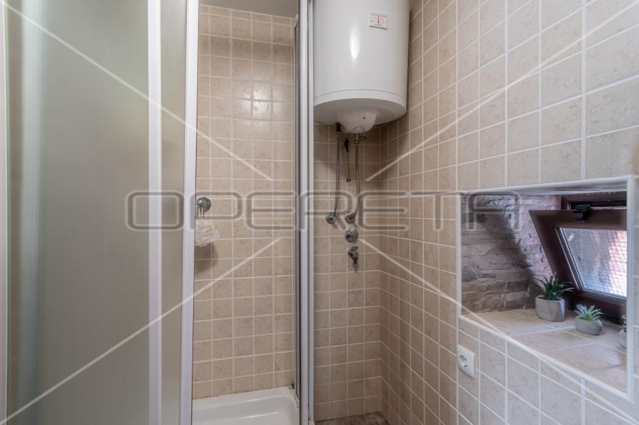 Na prvom katu nalazi se stan površine 38m2 koji se sastoji od kuhinje s blagovaonice i dnevnog boravka u jednoj cjelini s izlazom na terasi, jedne spavaće sobe i kupaonice.