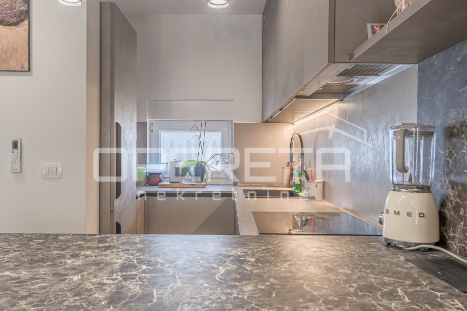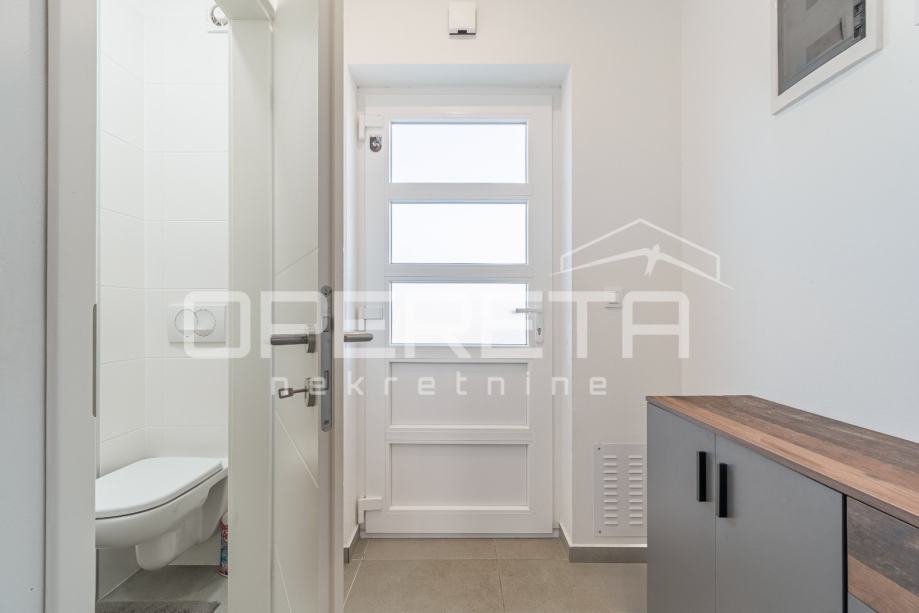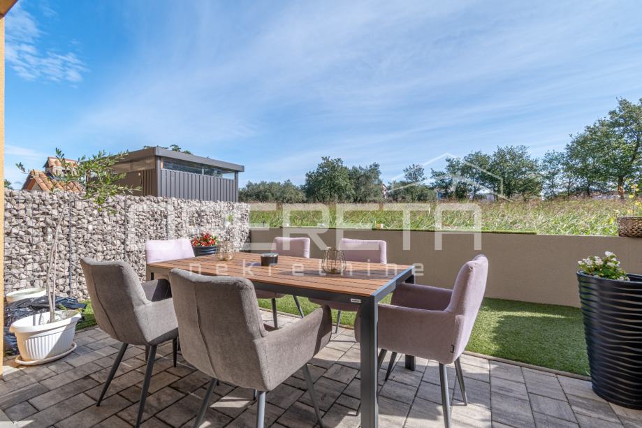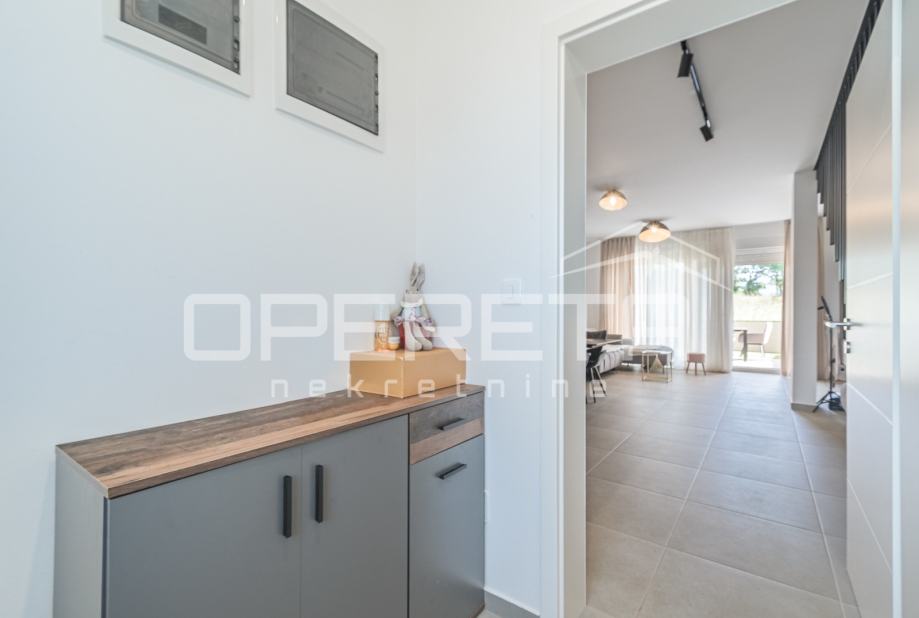 U prizemlju se nalazi ulazni hodnik, gostinjski toalet te moderno uređen open space prostor koji uključuje kuhinju, blagovaonicu i dnevni boravak s izlazom na vrt – idealan za opuštanje ili druženje na otvorenom.