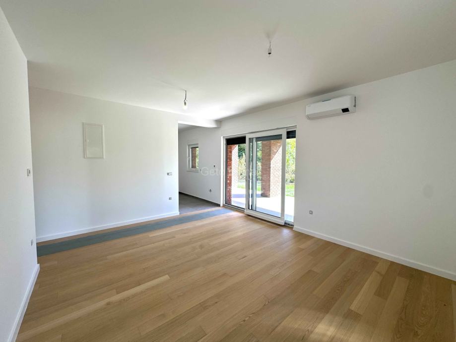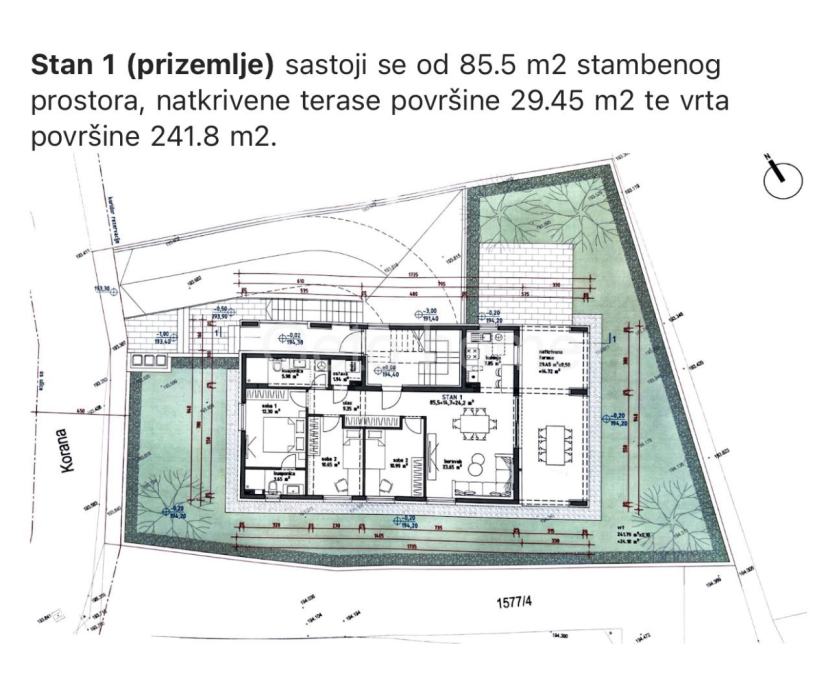 Prodaje se stan u prizemlju stambene zgrade u izgradnji, smješten u ulici Korana, Gornji Bukovac. Prodajna neto površina stana iznosi 135,21 m². Površina unutarnjeg prostora je 85,50 m², s natkrivenom terasom od 17,85 m² i vrtom. Stanu pripadaju dva garažna parkirna mjesta.