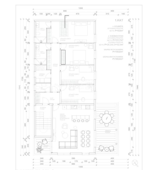Stan čine 4 spavaće sobe, 2 kupaonice, 1 gostinjski wc, vešeraj, dnevni boravak sa blagovaonom i kuhinjom ( open space koncept) iz čijeg prostora se izlazi na jednu veću terasu ( 22,2 m2) i manju terasu ( 4m2). Sa veće terase se silazi u vlastiti dio vrta.