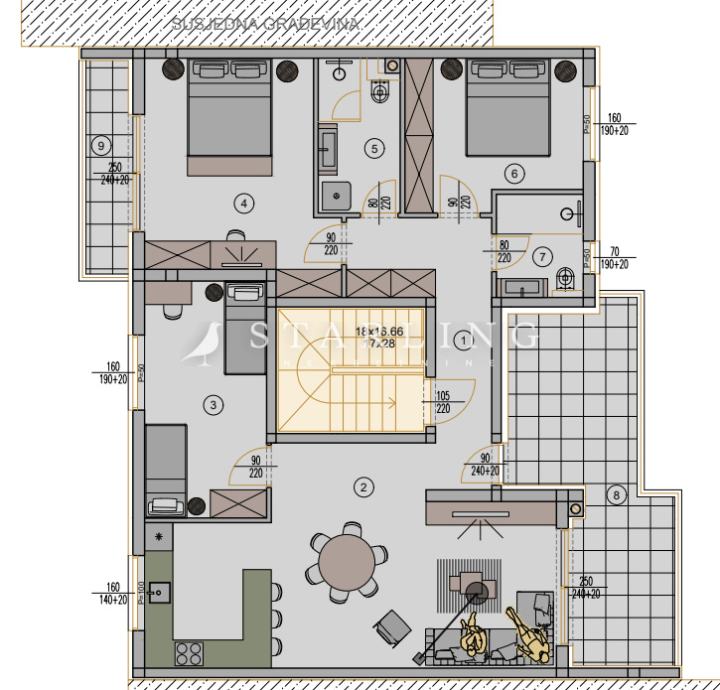 Prodaje se stan na drugom katu novogradnje, površine 114 m². Sastoji se od tri spavaće sobe, dnevnog boravka s kuhinjom i blagovaonicom te dvije moderno uređene kupaonice. Posebnu vrijednost daje prostrana terasa, idealna za boravak na otvorenom.