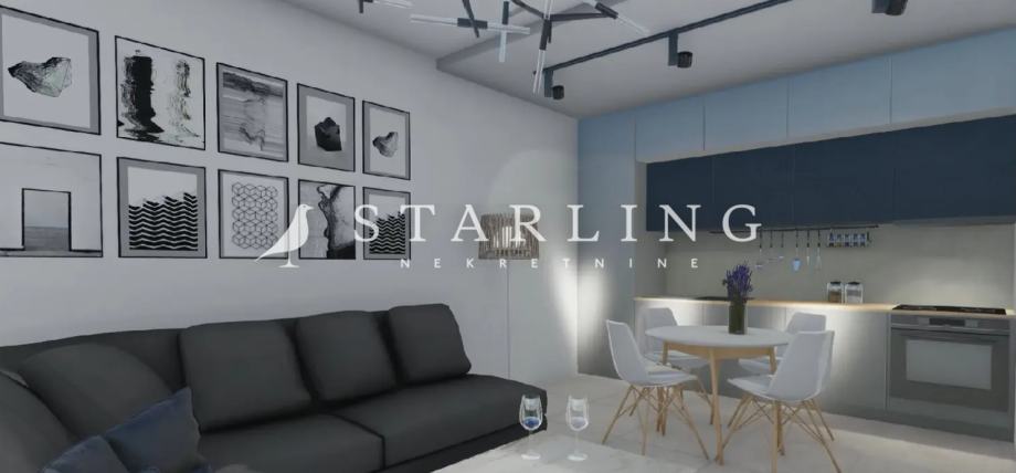 Stan se sastoji od prostranog dnevnog boravka, kuhinje i blagovaonice. Iz dnevnog boravka imamo direktan pristup prema natkrivenoj terasi. Stan ima dvije komforne spavaće sobe i kupaonicu.