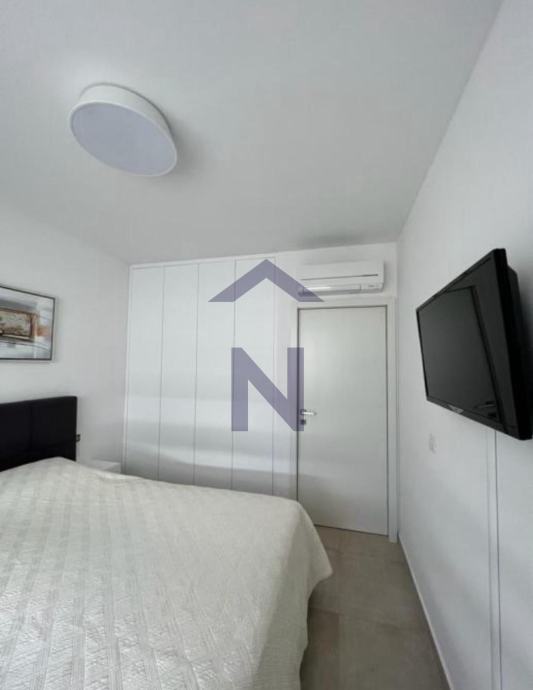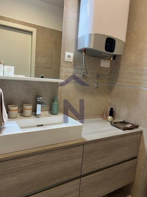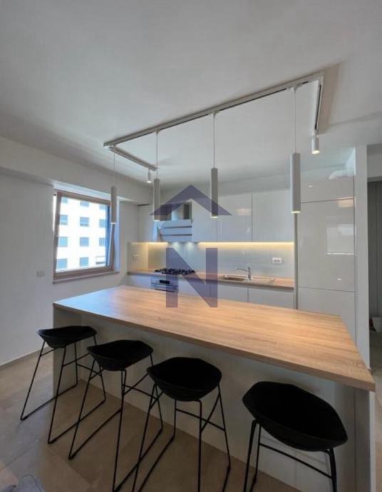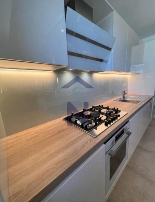Kuhinja je od renomiranog proizvođača DanKuchen iz Austrije.Model Silbermond, bijelo visokokvalitetno lakirane MDF fronte, vrhunski Blum okovi.Kuhinjski aparati: Bosch, Faber, Liebherr, Franke, Hansgrohe...Stan je opremljen modernim i kvalitetnim talijanskim namještajem; Natuzzi tosjed, blagovaonski stol i stolice, barske stolice, Hespo kreveti i premium visoki madraci. Ormari i komode u sobama, hodniku i dnevnom boravku su rađeni po mjeri od visokokvalitetnih MDF materijala (medijapan).LED rasvjetna tijela u svim prostorijama su visoke kvalitete.