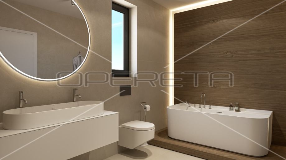- Pločice po cijeloj kući, dimenzija 120×60, bež boje, porculanska neporozna keramika, najtvrđa na tržištu