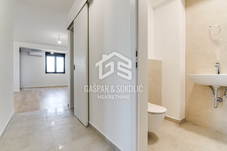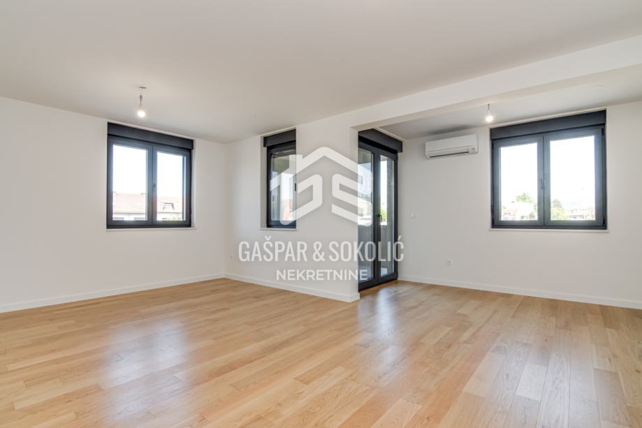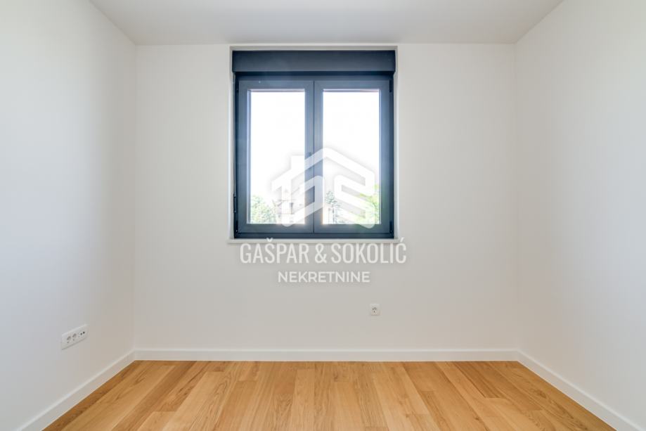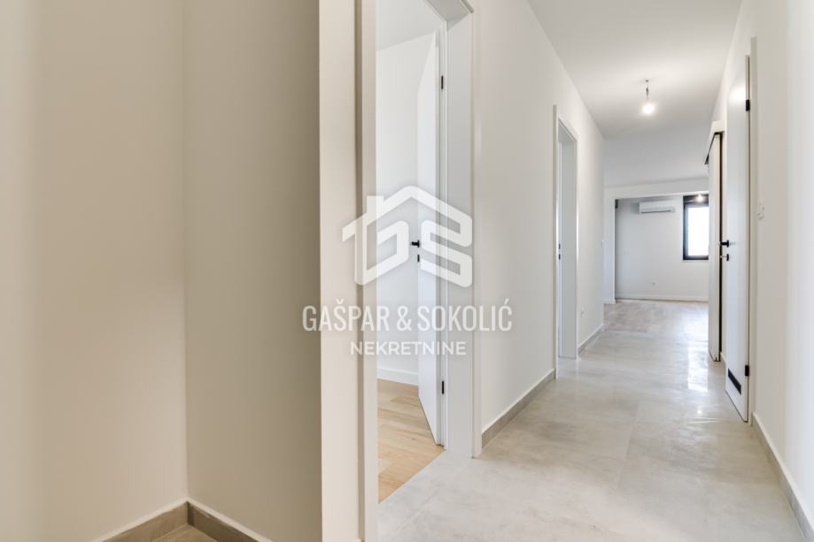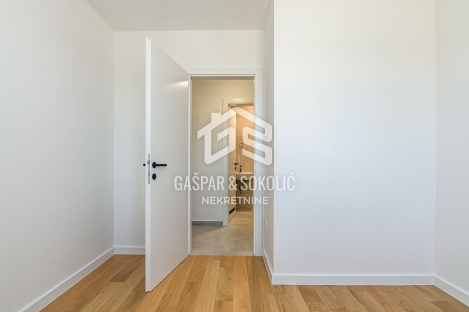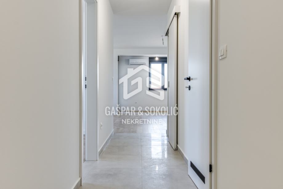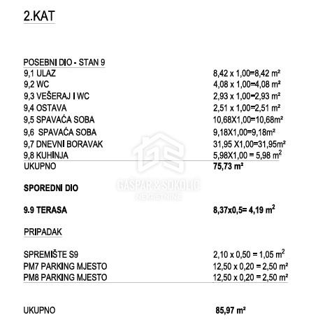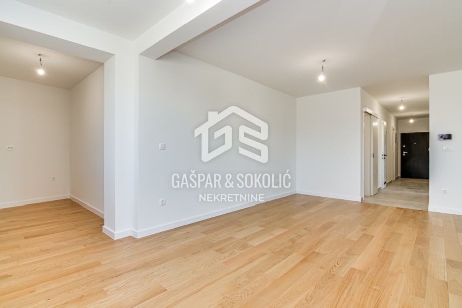 Stan ukupne površine 85,97 m² osmišljen je s naglaskom na udobnost i praktičnost. Sastoji se od prostranog dnevnog boravka povezanog s kuhinjom i blagovaonicom, koji čine centralni prostor stana. Tu su i dvije udobne spavaće sobe, idealne za obiteljski život, kao i moderna kupaonica koja zadovoljava sve potrebe za udobnost i funkcionalnost. Osim toga, stan sadrži i vešeraj te odvojeni WC, što dodatno doprinosi udobnosti svakodnevnog života.