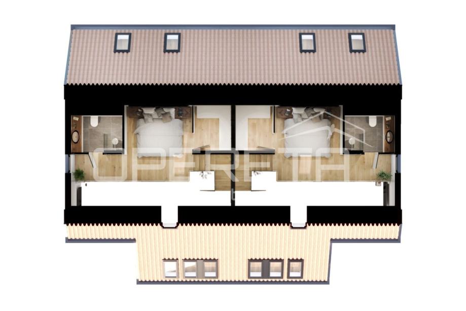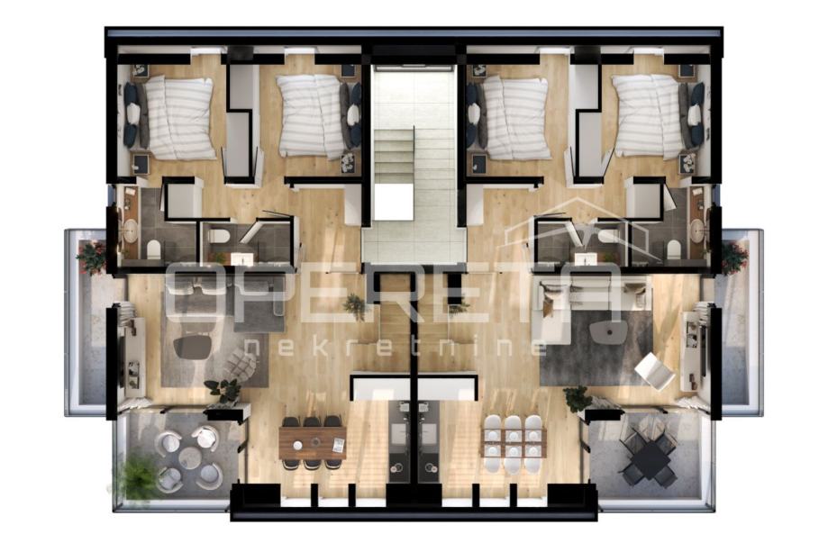 Prostor je pažljivo osmišljen kako bi pružio funkcionalnost i komfor – prostrani dnevni boravak povezan s kuhinjom i blagovaonicom, dvije spavaće sobe od kojih jedna ima vlastitu kupaonicu, te loggia i otvorene terase namijenjene opuštanju na otvorenom.