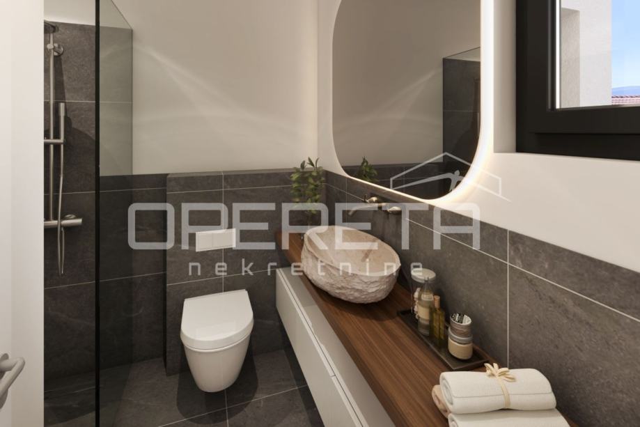 Stan je orijentiran prema sunčanoj južnoj strani, što osigurava obilje prirodnog svjetla tijekom cijelog dana. Gradnja visoke kvalitete i pažljivo odabrani materijali vidljivi su u svakom detalju – od napredne toplinske i zvučne izolacije, preko aluminijske stolarije s modernim kliznim sustavima, do kupaonica opremljenih Villeroy & Boch ugradbenim vodokotlićima.
