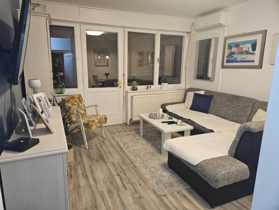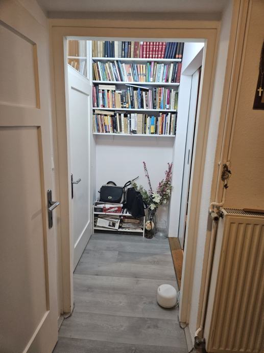 Stan na 3. katu koji se sastoji od predsoblja, dvije sobe, kuhinje, izbe, kupaonice i lođe površine 55,93m2. Pripadajuća šupa u podrumu površine 6m2. Stolarija je drvena i PVC (u dnevnom boravaku je drvena, a u spavaćoj sobi i kuhinji je PVC stolarija). Na podovima su laminati i pločice. Grijanje je centralno plinsko (novi kombi bojler).