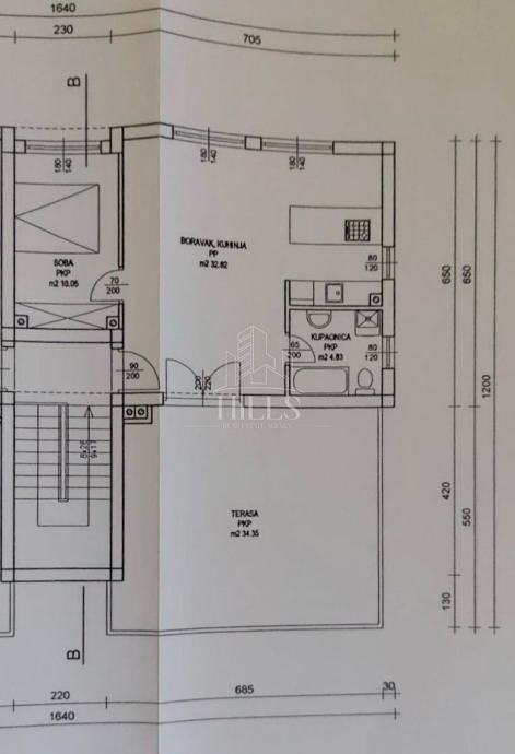 Prodaje se dvosoban stan koeficijentne površine 57 m2 (stan neto površine 48.5 m2 i terasa neto površine 34.5 m2) na 2. katu zgrade bez lifta.