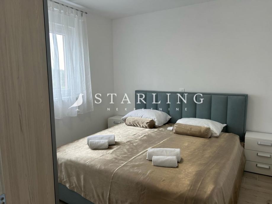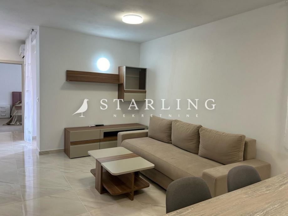 Stan je odličnog tlocrta i sastoji se od hodnika, kuhinje s blagovaonicom, komforne kupaonice ,dvije spavaće sobe i prostranog dnevnog boravka s izlazom na terasu. Ovaj stan krase moderan dizajn i funkcionalnost.