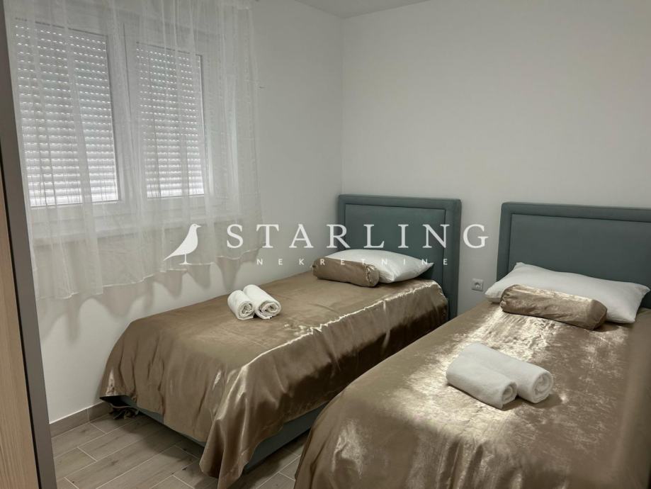 Stan je odličnog tlocrta i sastoji se od hodnika, kuhinje s blagovaonicom, komforne kupaonice ,dvije spavaće sobe i prostranog dnevnog boravka s izlazom na terasu. Ovaj stan krase moderan dizajn i funkcionalnost.