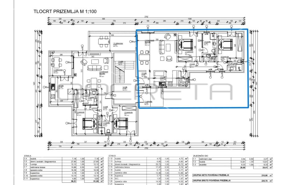 Stan A-B , smješten u prizemlju, ukupne površine 98,76 m2. Sastoji se od hodnika, kupaonice, tri spavaće sobe svaka sa svojom vlastitom kupaonicom, kuhinje te dnevnog boravka s blagovaonicom. Iz dnevnog boravka izlaz se na natkrivenu terasu i prostrani vrt površine cca 84 m2.