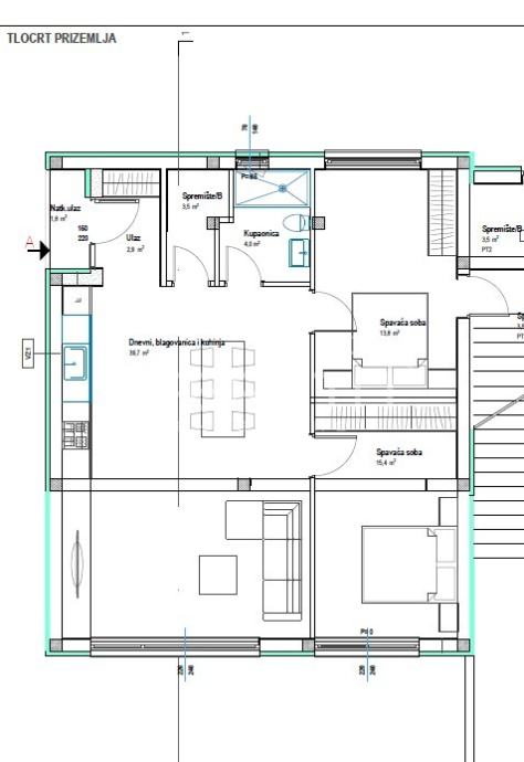 Na prvoj etaži nalazi se prostrani dnevni boravak u otvorenom konceptu s kuhinjom i blagovaonicom, te jedna kupaonica s WC-om. Gornja etaža, namijenjena odmoru, sadrži tri spavaće sobe i dvije kupaonice s WC-om, od kojih jedna pripada glavnoj, "master" spavaćoj sobi.