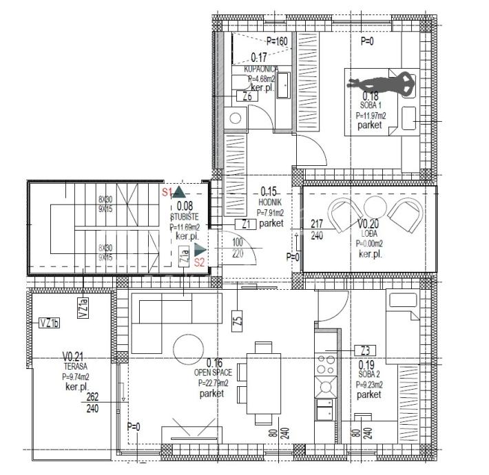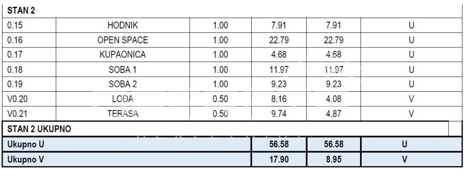 Stan se sastoji od prostranog open spacea a dnevnim boravkom, kuhinjom i blagovanociom, 2 spavaće sobe, kupaonice stambene površine 65,53 m2, sa balkonom 9,22m2, a pripada mu i garažno mjesto od 16,05 m2, vanjsko parkirno mjesto od 14,3 m2, spremište od 3,44 m2, tehnička prostorija 4,17 m2 (ukupna neto korisna površina 80.92m2).