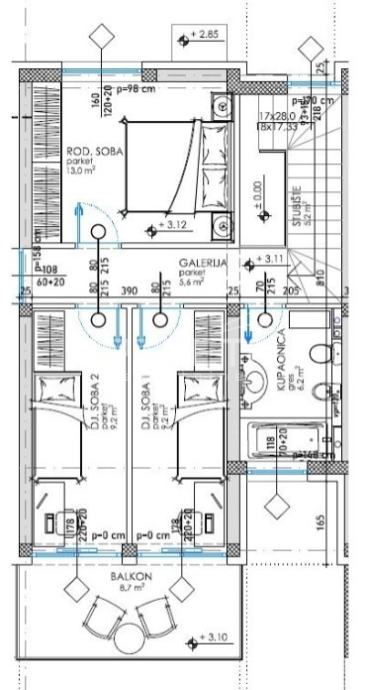 Na katu se nalaze ukupno 3 spavaće sobe i to jedna od 13 m2 i dvije od 9,2 m2, kao i balkon od 8,4 m2, kupaonica od 6,2 m2, galerija od 5,6 m2 i stubište od 5,2 m2.