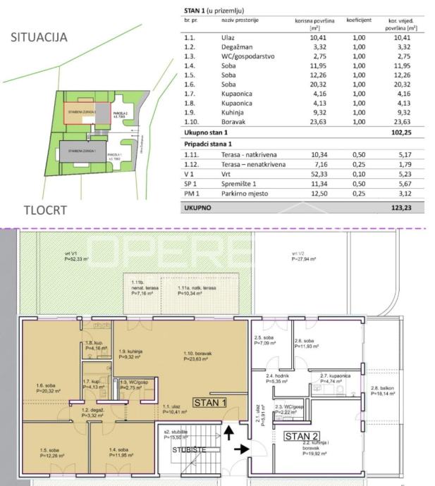 Stan 1 - četverosoban stan u prizemlju zatvorene površine 102,25 m2, polunatkrivena terasa 17,50 m2, vrt 52,33 m2. Stan se sastoji od ulaznog prostora, dnevnog boravka, blagovaonice i kuhinje otvorenog tlocrta s izlazom na terasu i vrt, master sobe s kupaonicom, dodatne dvije spavaće sobe, kupaonice i gostinjskog wc-a/gospodarstva. Stanu pripada vanjsko parkirno mjesto 12,50 m2, garaža 20,28 m2 i spremište 7,88 m2. Ukupno obračunski NKP 137,44 m2.