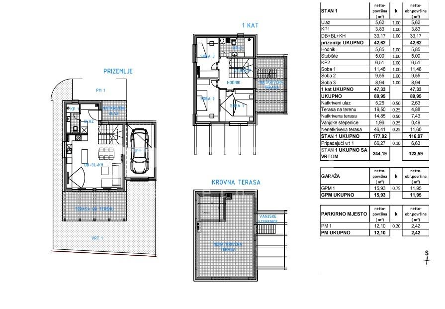 Stanu pripadaju i tri terase, od kojih je jedna krovna sa otvorenim pogledom na Zagreb. Svaka vila imati će svoju garažu te vanjsko parkirno mjesto. Postoji mogućnost kupnje dodatnog parkirnog mjesta.