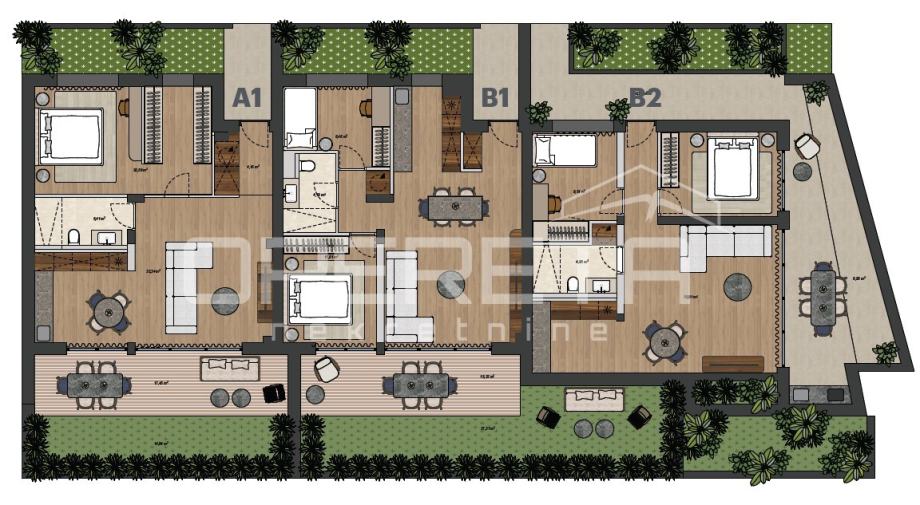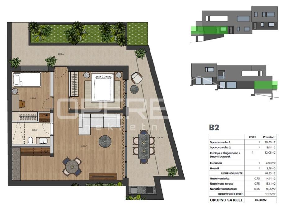 Stan B2 stambene kvadrature 61,23m2 sa prostranom, djelomično natkrivenom terasom sastoji se od prostranog boravka sa kuhinjom i blagovaonicom, dvije spavaće sobe te ulaznog prostora i kupaonice.