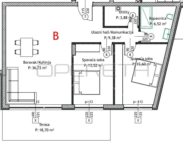 Istra, Rovinj: Prodaje se dvosobni stan u prizemlju stambene zgrade u izgradnji, stan B. Stambena površina iznosi 91 m². Stan se sastoji od ulaznog hola i komunikacijskog prostora od 9,38 m², dnevnog boravka s kuhinjom od 36,72 m², utility prostora od 9,28 m², dvije spavaće sobe površina 19,92 m² i 5,49 m², te kupaonice od 24,57 m². Također, stan ima terasu od 18,70 m².