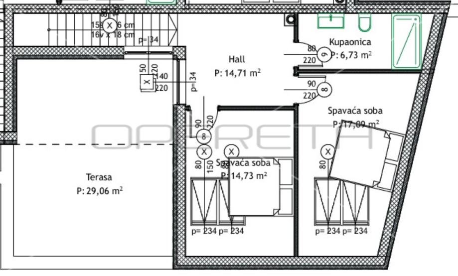 U potkrovlju se nalaze hodnik od 14,71 m², dvije spavaće sobe od 14,73 m² i 17,09 m², kupaonica od 6,73 m² te terasa od 29,06 m².