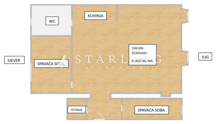 Stan se sastoji od dnevnog boravka, dvije spavaće sobe, kuhinje i kupaone.