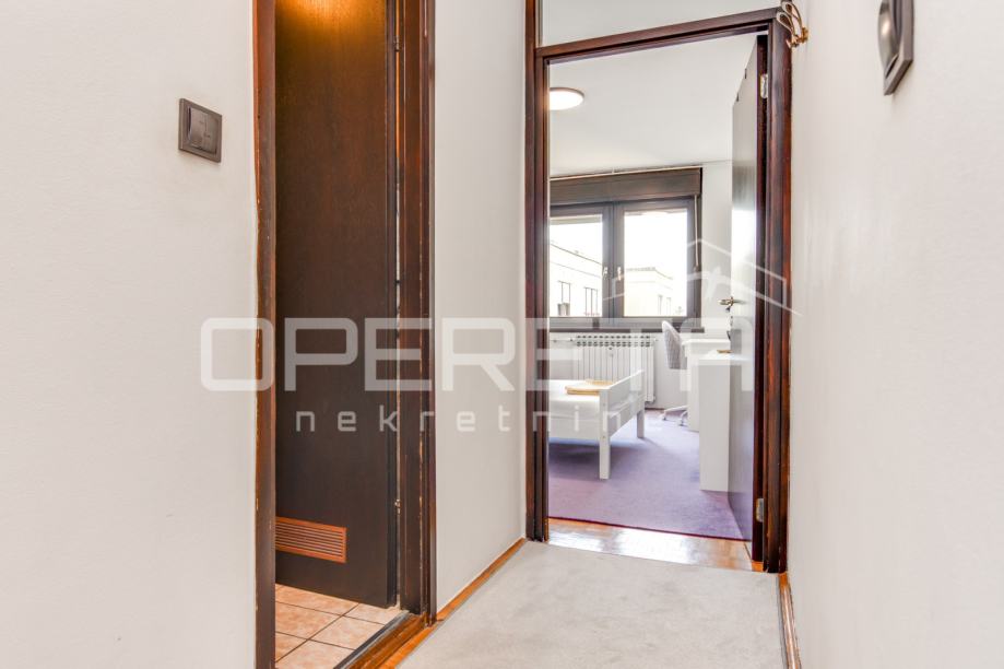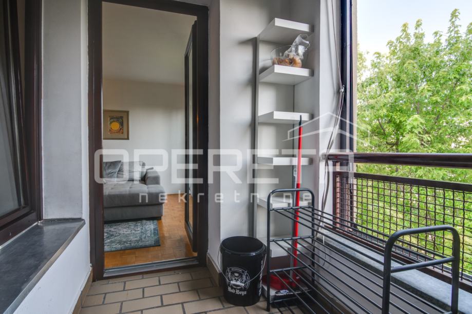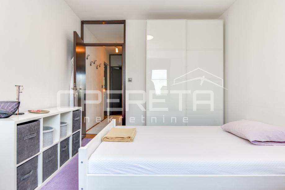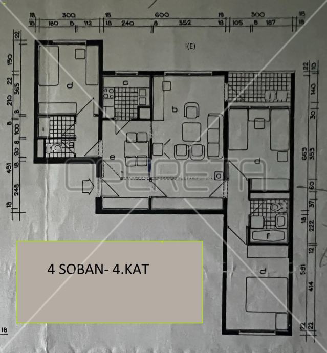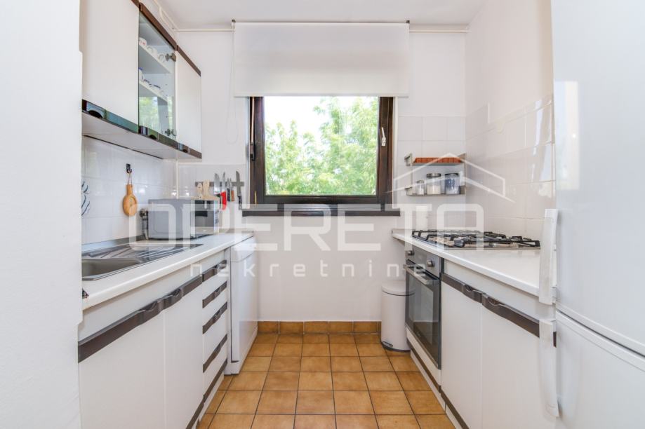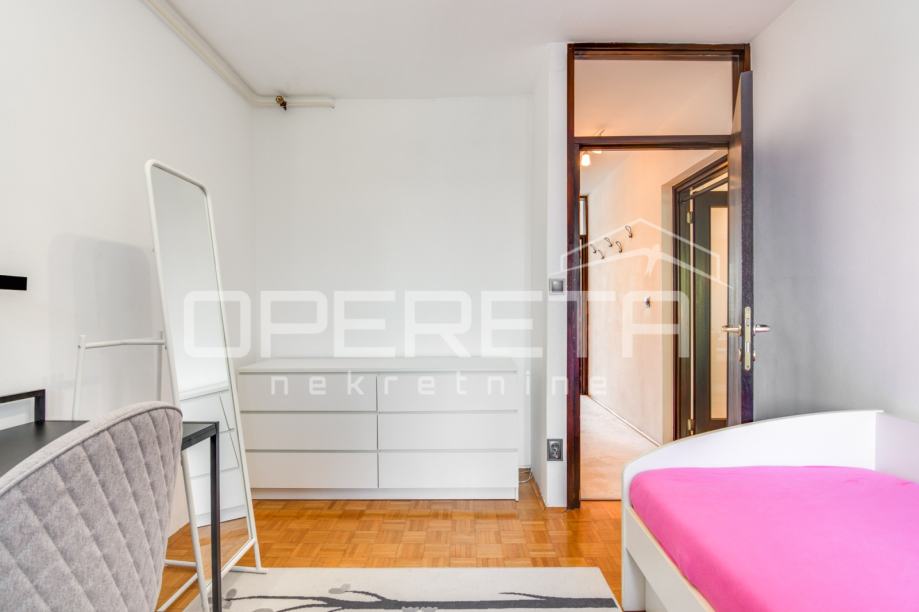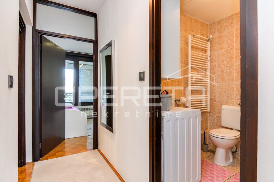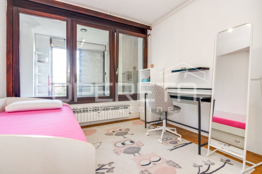U vrlo dobrom stanju prostrani 4-soban stan koji se sastoji od ulaznog hodnika gdje je smještena blagovaonica, kuhinje, dnevnog boravka s izlazom na lođu, 3 spavaće sobe, kupaonice s WC-om, odvojenog WC-a te ostave.