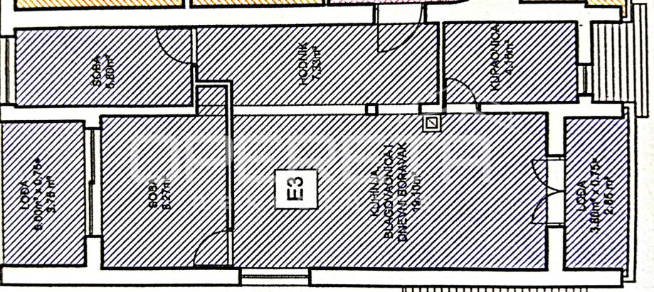 Sastoji se od dvije spavaće sobe, kuhinje blagovaone, dnevnog boravka i kupaonice saWC-om što sve zajedno čini 47m2 zatvorene površine. Stanu, obračunato prema koeficijentima, pripdaju i dvije logge kao i vanjsko parkirno mjesto.
