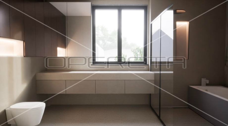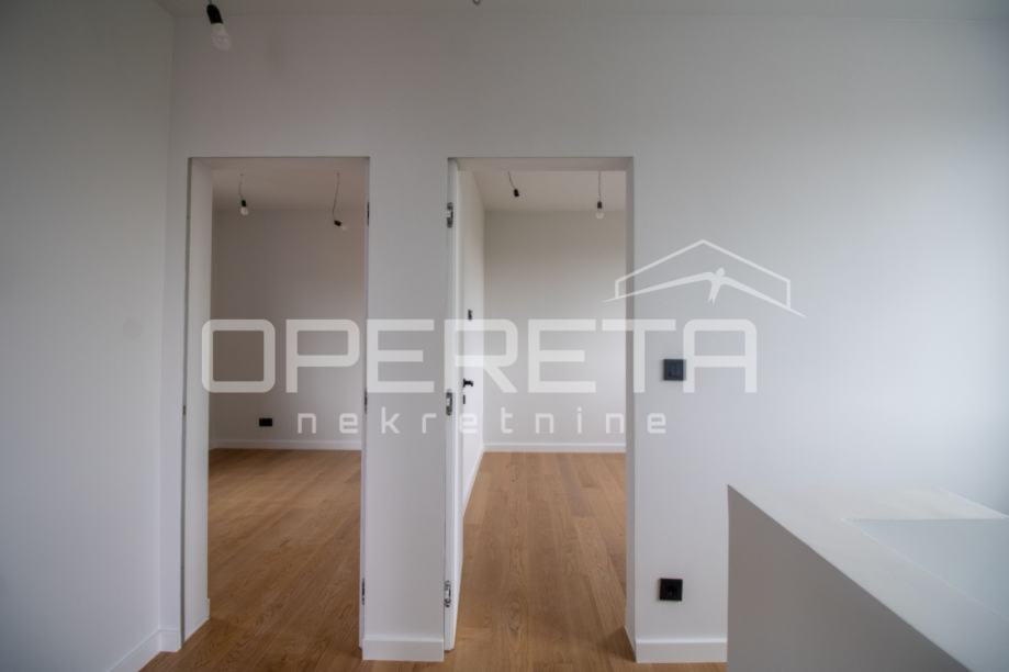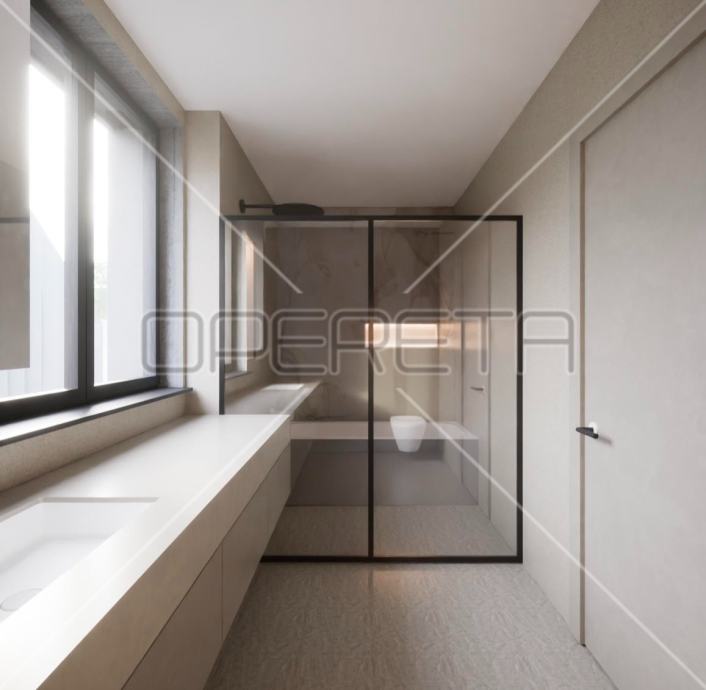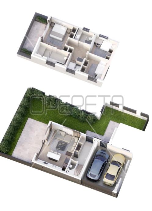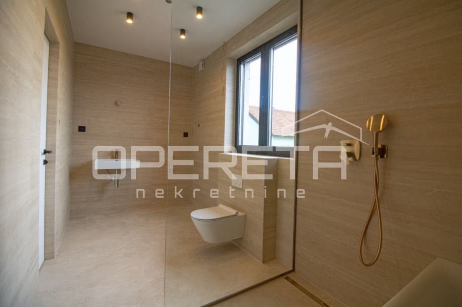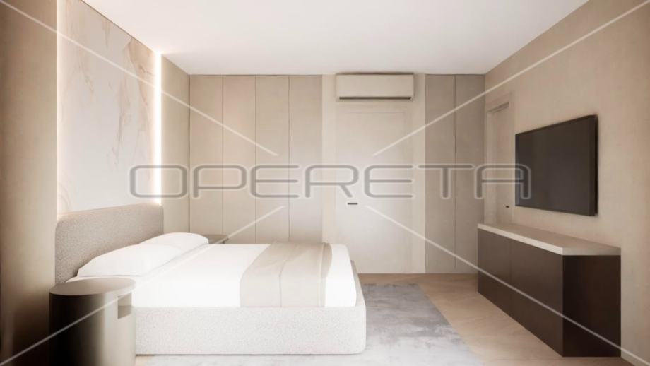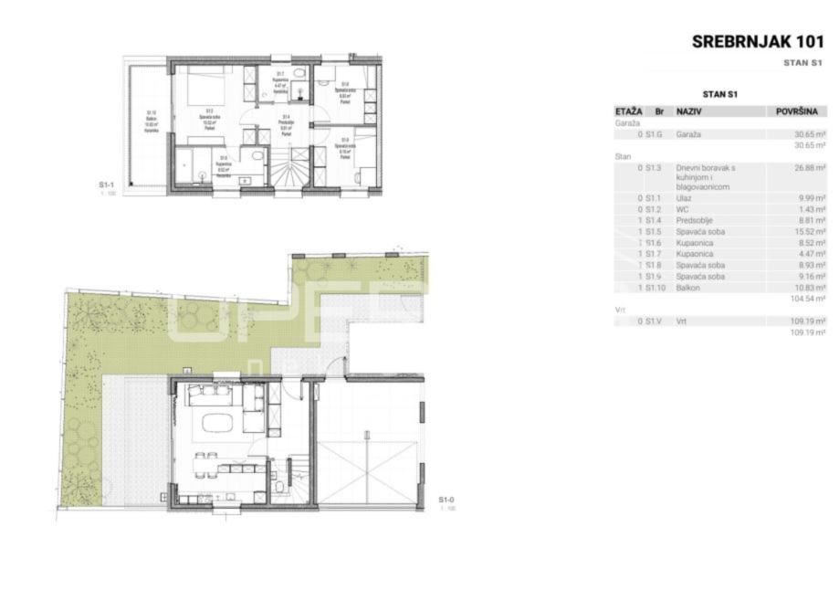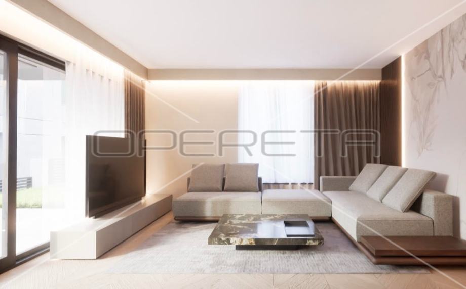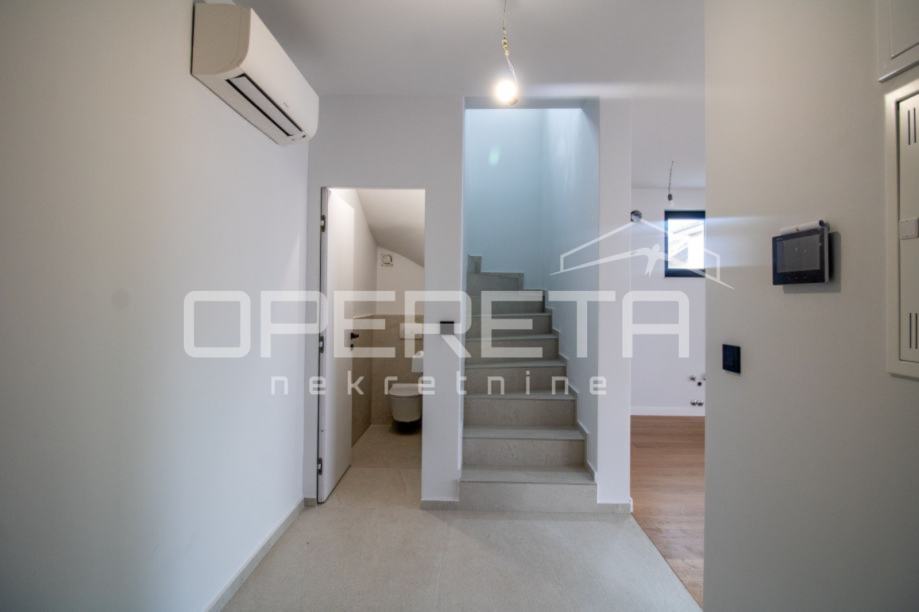 Luksuzan dvoetažan četverosoban stan zatvorene površine 105m2, vrt 109m2, garaža 30,65 m2. Ukupno obračunski NKP 125m2. Sastoji se od predsoblja, dnevnog boravka s kuhinjom i blagovaonicom otvorenog tlocrta s izlazom na terasu i vrt, gostinjskog wc-a na gornjoj etaži, predsoblja, master sobe s garderobom, kupaonicom i izlazom na balkon, dvije spavaće sobe i kupaonice.