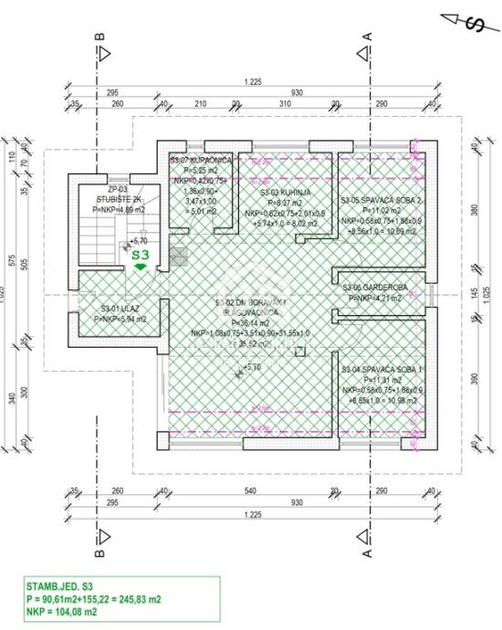 Ukupna površina stana iznosi 105 m², a raspored je osmišljen tako da pruža prostranost i funkcionalnost. Stan se sastoji od dnevnog boravka s blagovaonicom, povezane kuhinje, dvije udobne spavaće sobe, moderne kupaonice, garderobe i dodatnog spremišta.