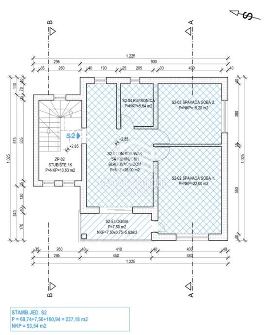 Ukupna površina stana iznosi 90,40 m², a odlikuje se funkcionalnim rasporedom i prostranošću. Sastoji se od dnevnog boravka povezanog s kuhinjom i blagovaonicom, dvije udobne spavaće sobe te moderne kupaonice. Dodatnu vrijednost prostoru daje lođa površine 7,50 m², pogodna za opuštanje i boravak na otvorenom.