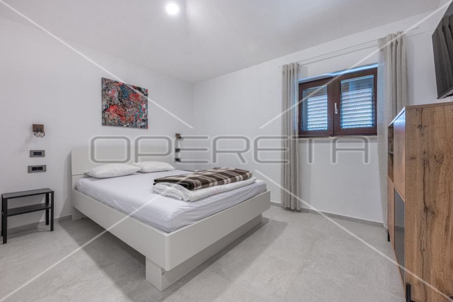 Sastoji se od hodnika, wc-a, kupaonice, ostave, dvije spavaće sobe i dnevnog boravka, kuhinje i blagovaonice po open space konceptu.