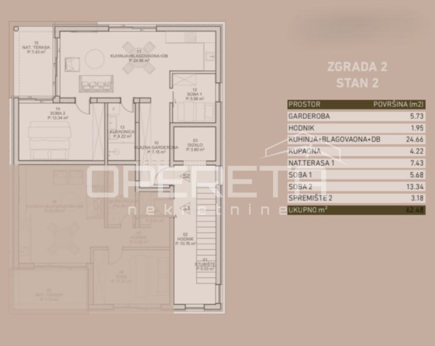 Stan na 1. katu stambene površine 63m2 sastoji se od ulaznog prostora, jedne veće i jedne manje spavaće sobe, moderne kupaonice, dok centralni dio čini prostrani dnevni boravak s kuhinjom i blagovaonicom, iz kojeg se izlazi na natkrivenu terasu.