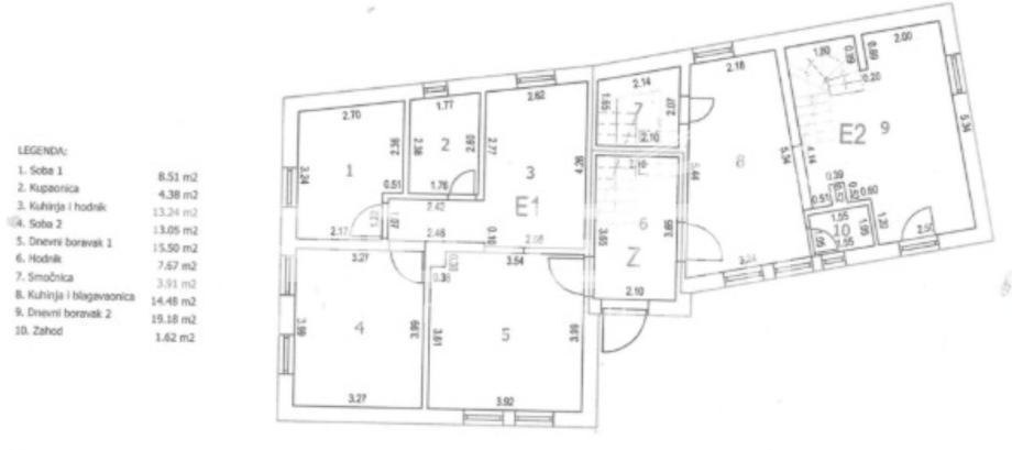 Stan na dvije etaže (prizemlje-prvi kat) u novogradnji od 76,36 m2 u centru Varaždinskih toplica, 80-ak metara od Minerve i liječilišta u strogo zaštićenom centru grada. Vrlo mirna lokacija bez prometa, blizu svih važnih sadržaja. Kuća novogradnja u stilu tradicijske gradnje, sa energetskih certifikatom A u roh- bau izvedbi. Potrebno je ugraditi parkete u sobe i unutarnju stolariju. Stan ima dimnjak za kamin na kruta goriva, kao alternativa grijanju na plin, ili guštanju uz kamin, što je vrlo rijetko u novogradnji. Sastoji od prostorija u prizemlju: smočnica,kuhinja i blagovaonice, dnevnog
