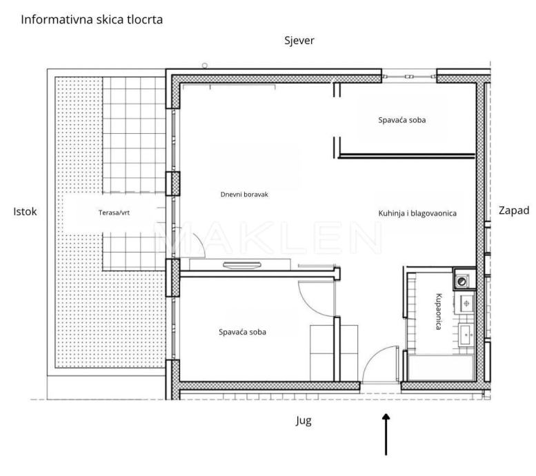 Stan se sastoji od dnevnog boravka s kuhinjom i blagovaonicom, dvije spavaće sobe, kupaonice, hodnika te natkrivere terase s vrtom.