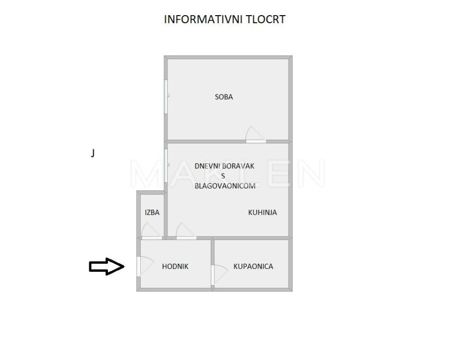 Stan se sastoji od dnevnog boravka s kuhinjom i blagovaonicom, kupaonice, hodnika, lzbe te terase.