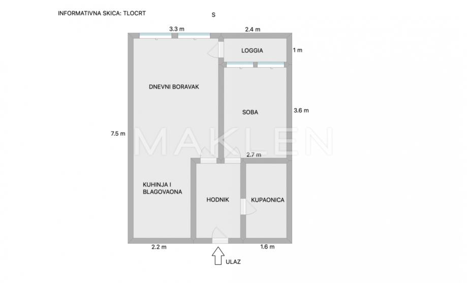 Stan se sastoji od dnevnog boravka s blagovaonicom, kuhinje, spavaće sobe, kupaonice, hodnika te loggie.