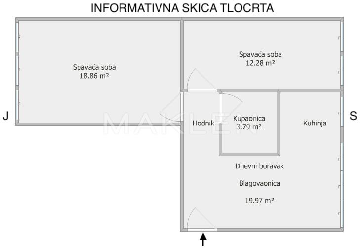 Stan se sastoji od dnevnog boravka s kuhinjom i blagovaonicom, dvije spavaće sobe, kupaonice te hodnika.