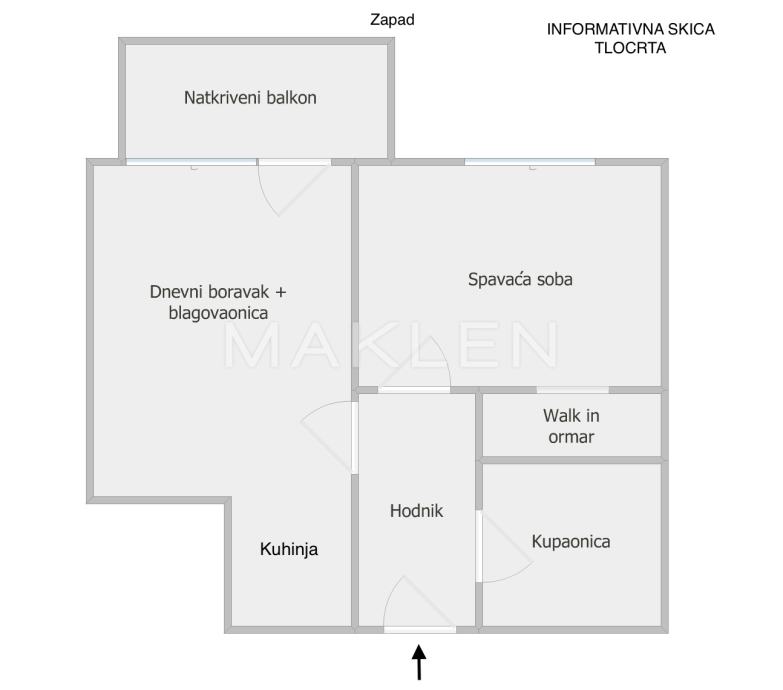 Stan se sastoji od dnevnog boravka s blagovaonicom i kuhinjom, spavaće sobe s walk in ormarom, kupaonice, hodnika te natkrivenog balkona.