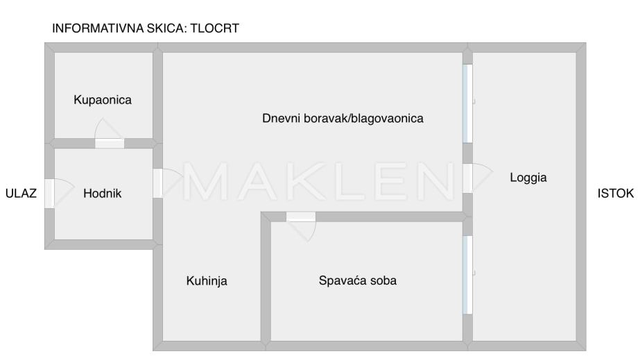 Stan se sastoji od open space dnevnog boravka s blagovaonicom i kuhinjom, spavaće sobe, kupaonice, hodnika te loggie.
