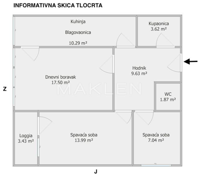 Stan se sastoji od dnevnog boravka, kuhinje s blagovaonicom, dvije spavaće sobe, kupaonice, WC-a, hodnika te loggie.