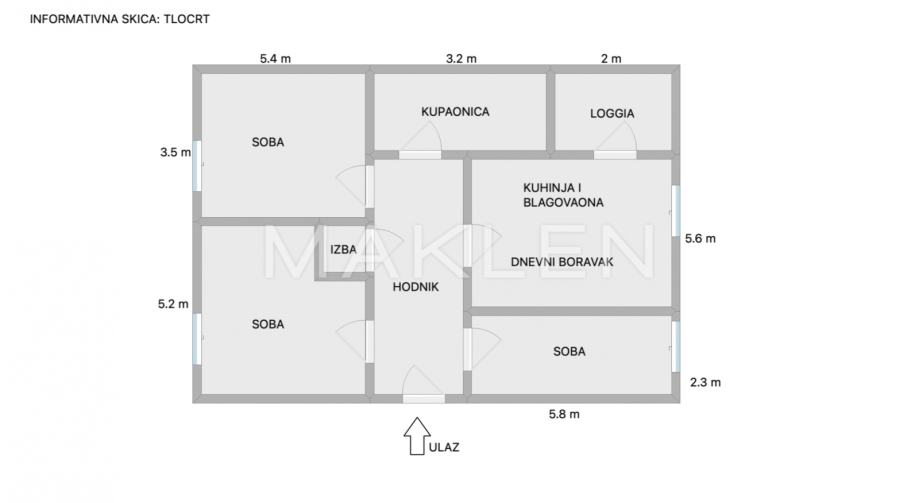 Stan se sastoji od dnevnog boravka s kuhinjom i blagovaonicom, tri spavaće sobe, kupaonice, hodnika, izbe, loggie te spremišta u prizemlju.