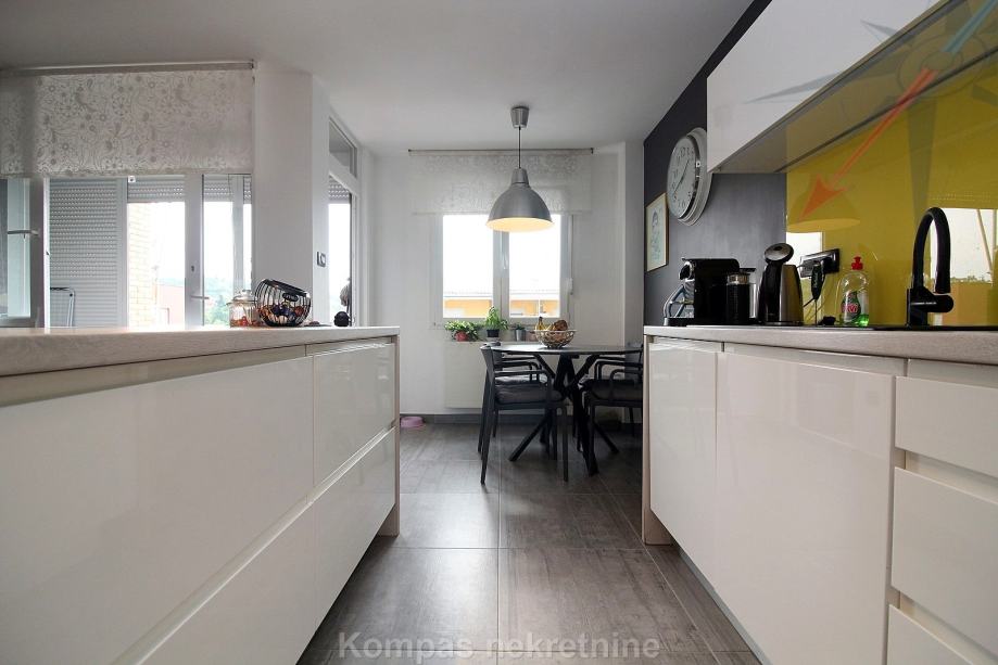 Moderno namješten 3-soban stan ( 73 m2 ) na trećem katu stambene zgrade s liftom, Ulica Side Košutić. Stan je potpuno renoviran 2015. godine kada su promijenjene sve instalacije struje, vode, odvoda, stavljena nova glazura, 5 komorna PVC stolarija, parket hrast seljački pod, keramičkie pločice sa podnim grijenjem, nova kuhinja, renovirana kupaonica, toalet, loggia i napravljeni ugradbeni ormari. Sastoji se od ulaznog hodnika, dnevnog boravka, kuhinje, dvije spavaće sobe, kupaonice, toaleta, zatvorene loggie. Stan ima protuprovalna vrata, plinsko etažno grijanje, dizajnerske radijatore Radson Ramo s razdjelnicima topline, LG klima uređaj, mogućnost brzog interneta. Sva brojila su odvojena i režije se plaćaju prema stvarnoj potrošnji. Stanu pripada spremište ( 3 m2 ) u podrumu zgrade. U toku je energetska obnova fasade, krovišta, vanjske i unutrašnje stolarije, lifta i kotlovnice zgrade, sredstvima EU fondova u iznosu od preko 4 000 000 eura. Na krovu zgrade će biti ugrađeni solarni paneli za struju u zajedničkim prostorijama. Pričuva za stan iznosi 100 eura. Besplatno parkiranje moguće je na parkiralištima oko zgrade. Stan se nalazi u neposrednoj blizini osnovne škole, parkova, više autobusnih linija, željezničke stanice i ostalih važnijih sadržaja u samom naselju.