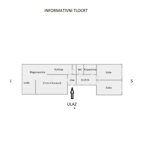 Stan se sastoji od dnevnog boravka, kuhinje s blagovaonicom, dvije spavaće sobe, kupaonice, WC-a, hodnika, ostave te loggie.