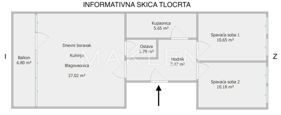 Stan se sastoji od dnevnog boravka s kuhinjom i blagovaonicom, dvije spavaće sobe, kupaonice, hodnika, ostave te balkona.