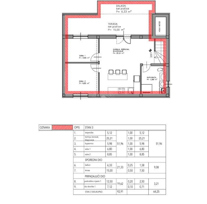 Na prodaju ugodan dvoetažni stan BRUTO površine 92,91 m2 => NKP 64,25 m2, smješten u manjoj stambenoj zgradi s ukupno dva kata. Stan zauzima prvi i drugi kat, pri čemu prva etaža služi kao ulazni hodnik s pristupom stepenicama koje vode do glavnog stambenog prostora na drugoj etaži.