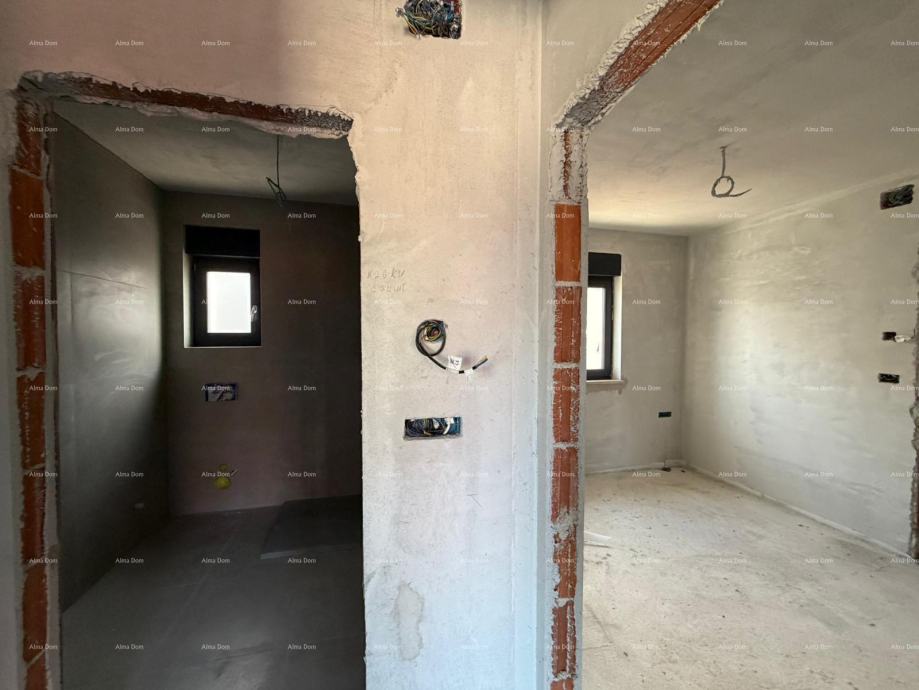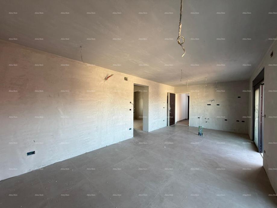 Stan se nalazi na 1. katu stambene zgrade i sastoji se od: ulaznog hodnika, open space kuhinje, blagovaone i dnevnog boravka s izlazom na natkriveni balkon, 2 spavaće sobe i 2 kupaonice.